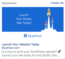 Bluehost的Facebook广告标题告诉用户该服务可以为他们做些什么,以及他们当天可以启动他们网站的事实肯定会引起他们的兴趣: